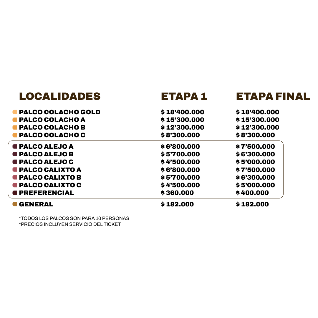 Solo las localidades Palco Alejo, Palco Calixto y Preferencial tienen precio con descueto en Etapa 1. Los precios pueden fluctuar en función a la oferta y la demanda.