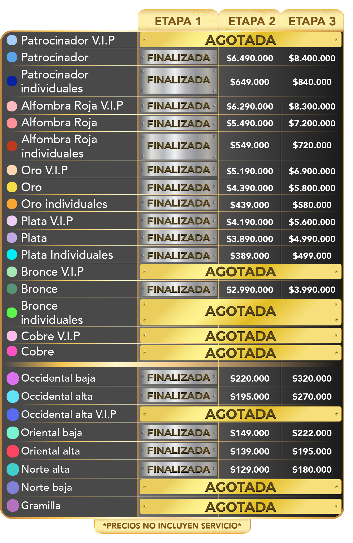 Palco Oro VIP x 10 Personas | $5.700.000 + $1.153.200 | 80 |
