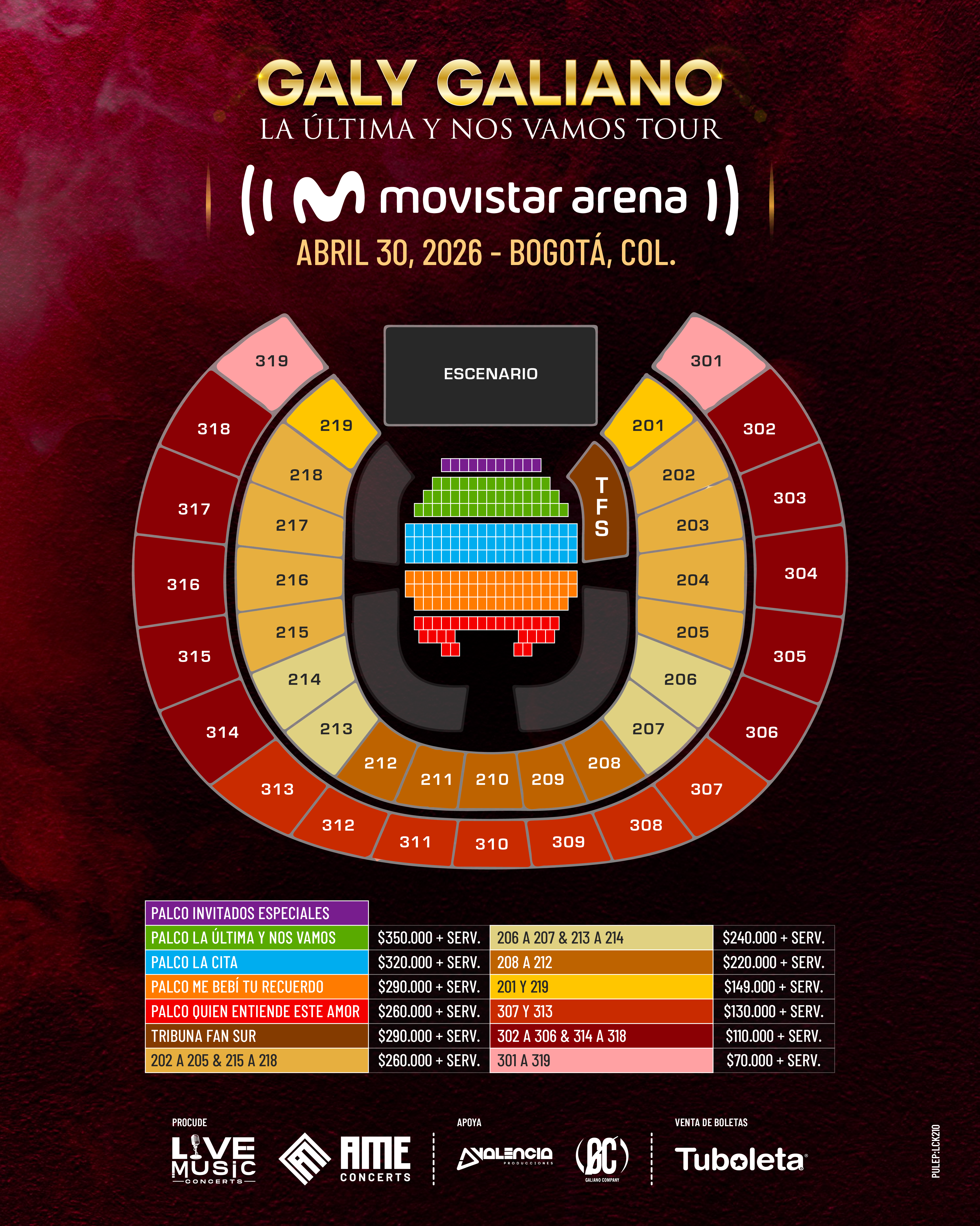 - Los sectores: 201, 219, 301 y 319 pueden tener restricciones de visibilidad dependiendo del montaje que se realice del espectáculo, pantallas, escenarios luces, sonido, etc, situación que reconoce y acepta en el momento de comprar las boletas. En los casos anteriores, no serán de recibo posteriores quejas o reclamaciones relacionadas con este aspecto, es decir con la visibilidad del espectáculo.