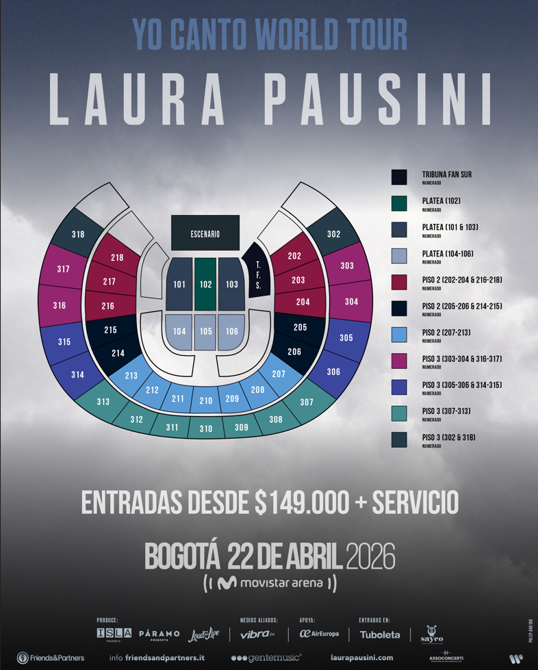 Laura Pausini, una de las voces más reconocidas de la música italiana y ganadora de múltiples premios internacionales, regresa a Bogotá con su “Yo Canto World Tour”. La cita es el próximo 22 de abril en el Movistar Arena, en una noche que promete emocionar a sus fans con los grandes éxitos de su carrera y nuevas interpretaciones en vivo.