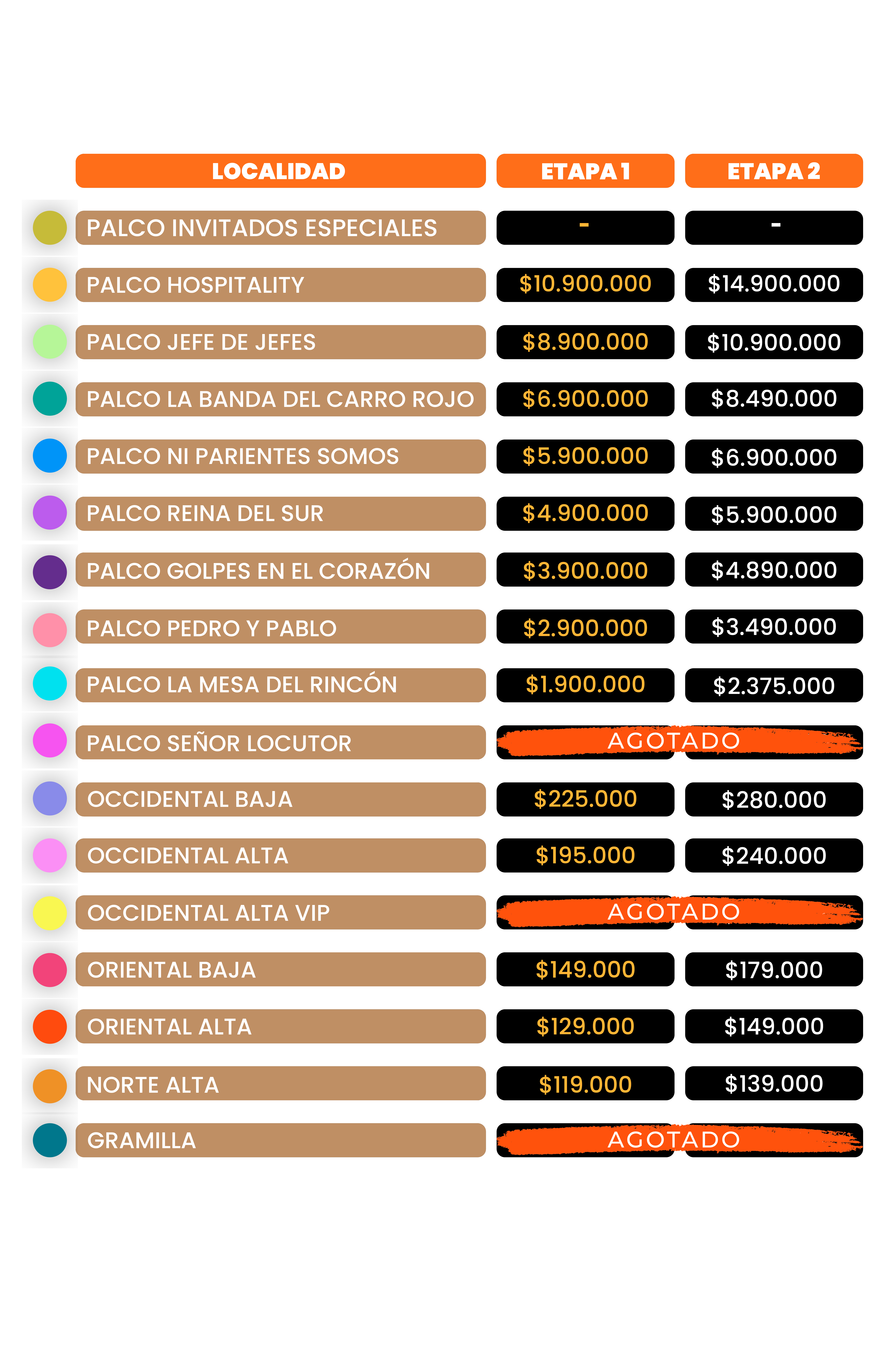 | Palco Jefe de Jefes* | $8.900.000 + $1.960.000 | 136 |
