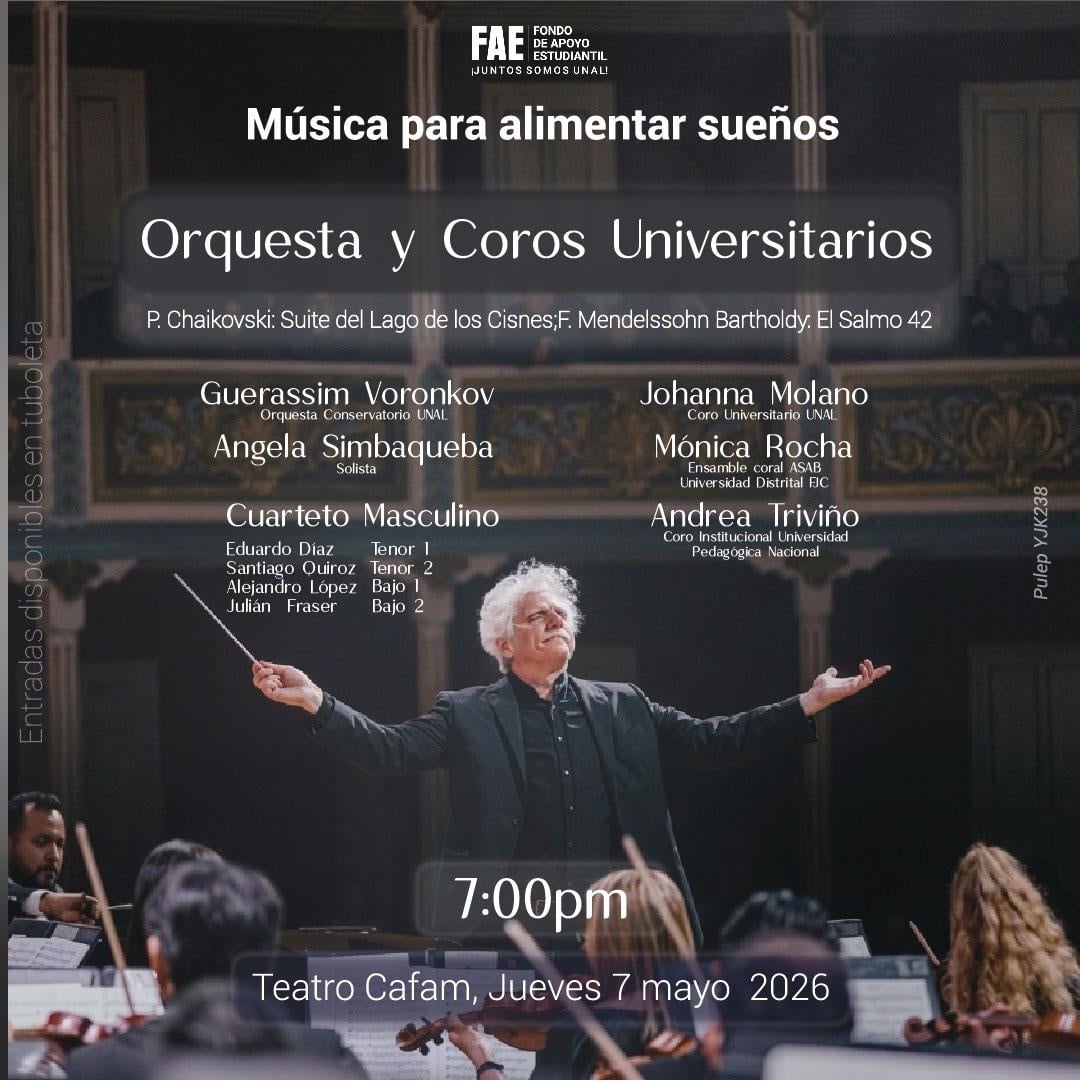 Con el propósito de recaudar recursos que permitan continuar apoyando a estudiantes de la Universidad Nacional en condición de vulnerabilidad, el Fondo de Apoyo Estudiantil de la Universidad Nacional de Colombia continúa en su programación de eventos en su lema "Alimentando Sueños", presentando en esta ocasión a la Orquesta y Coro del Conservatorio de Música de UNAL con:
