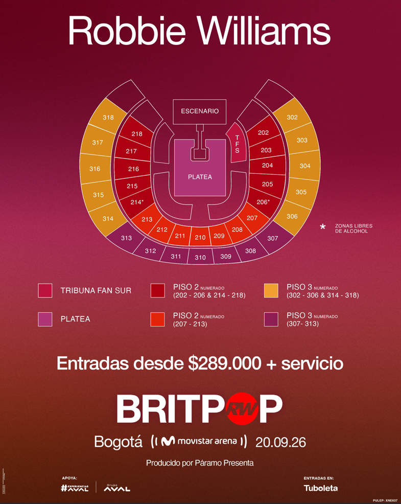 Robbie Williams llega por primera vez a Colombia con un espectáculo que celebra más de tres décadas de himnos globales y carisma escénico incomparable.