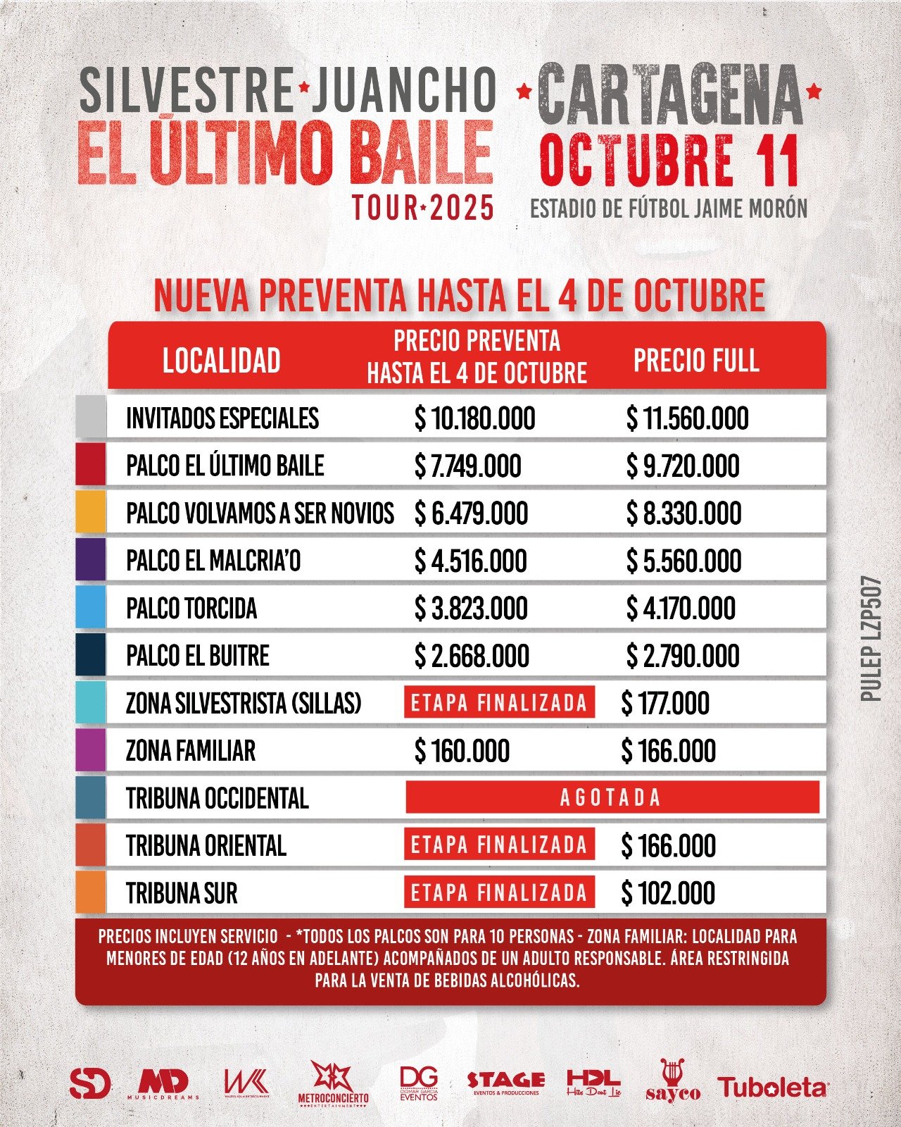 Palcos El Último Baile* | $6.700.000 + $1.049.000 | 2.860 |