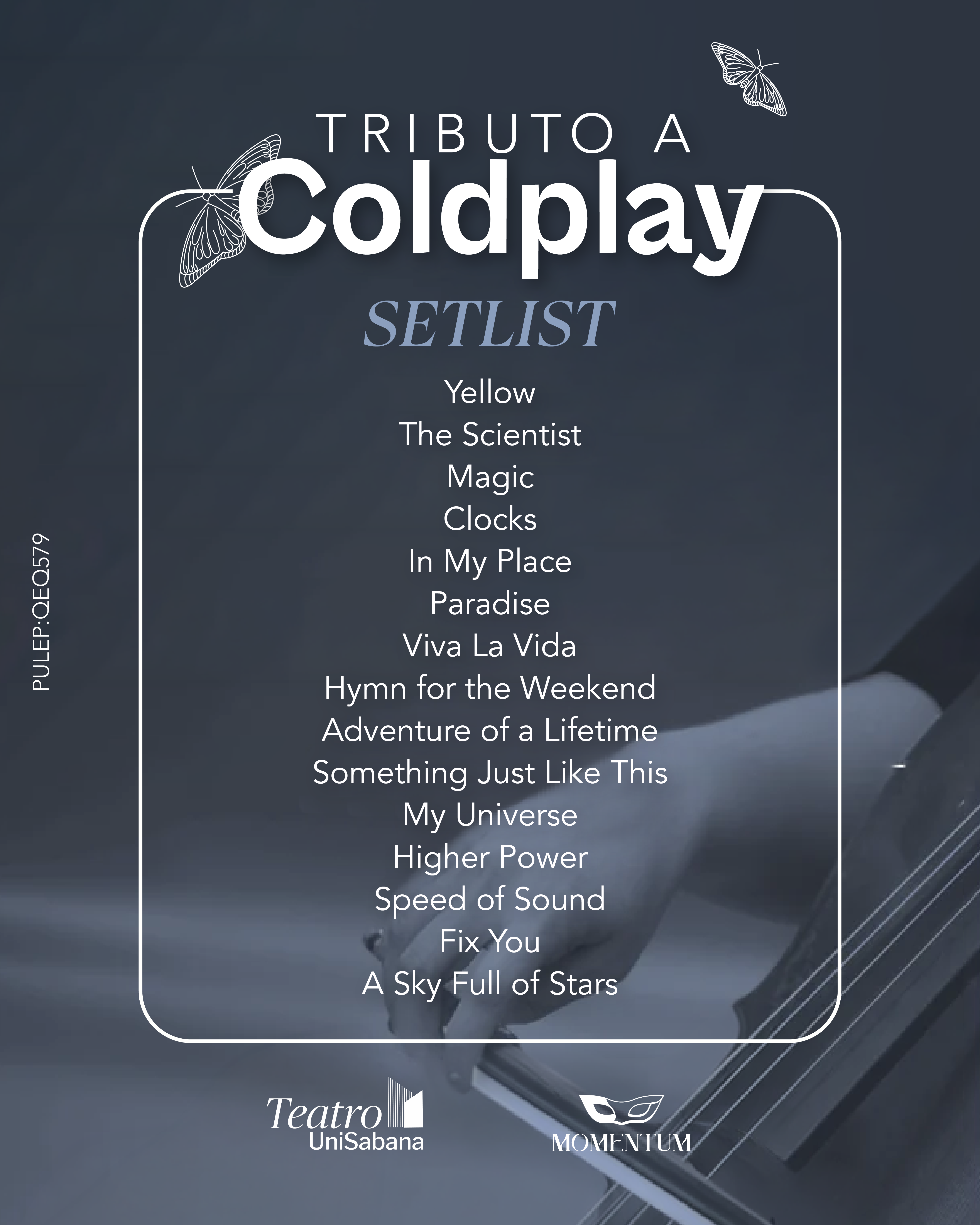 Momentum “Tributo a Coldplay” es una experiencia escénica inmersiva que fusiona música en vivo, diseño visual y ritual simbólico en un formato contemporáneo y altamente sensorial. Concebida como un espectáculo íntimo y envolvente, la función propone un recorrido por los grandes éxitos de Coldplay reinterpretados en un formato de cámara con quinteto de cuerdas que resalta la fuerza emocional y la riqueza melódica de su música.