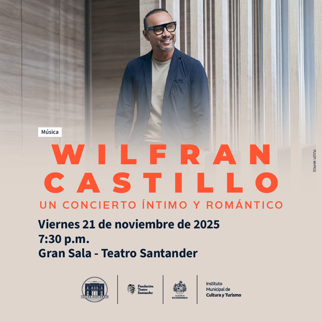 El Teatro Santander se viste de gala para recibir a Wilfran Castillo, uno de los compositores y cantautores más importantes de Colombia, en un concierto íntimo y romántico donde las melodías se entrelazan con las historias que les dieron vida.
