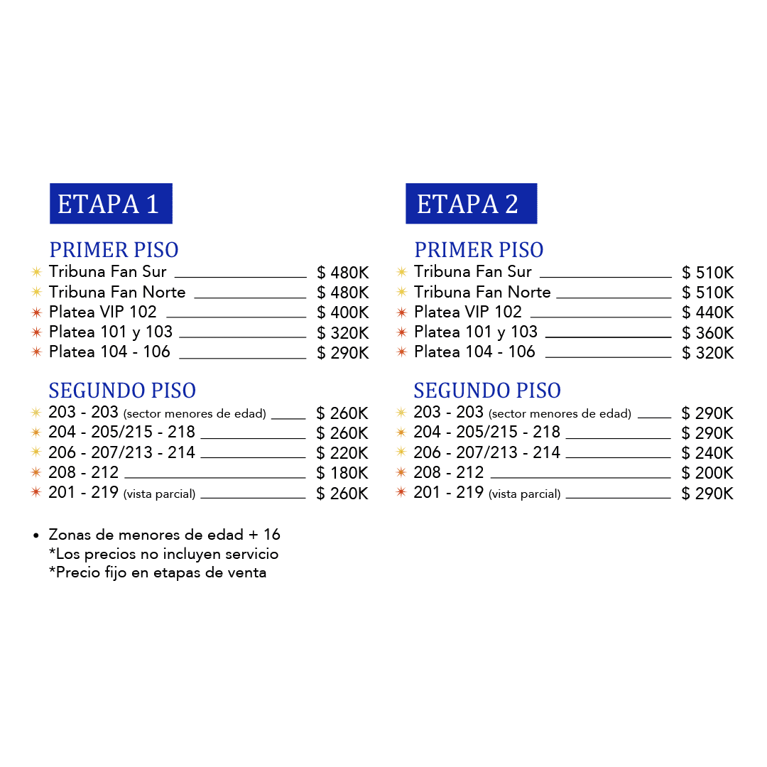 - Se informa a los usuarios que los precios de la boletería para cada localidad experimentarán una transición de la Etapa 1 al Precio Full una vez que se alcance y complete el aforo designado para dicha localidad contemplado en la tabla anterior de precios.