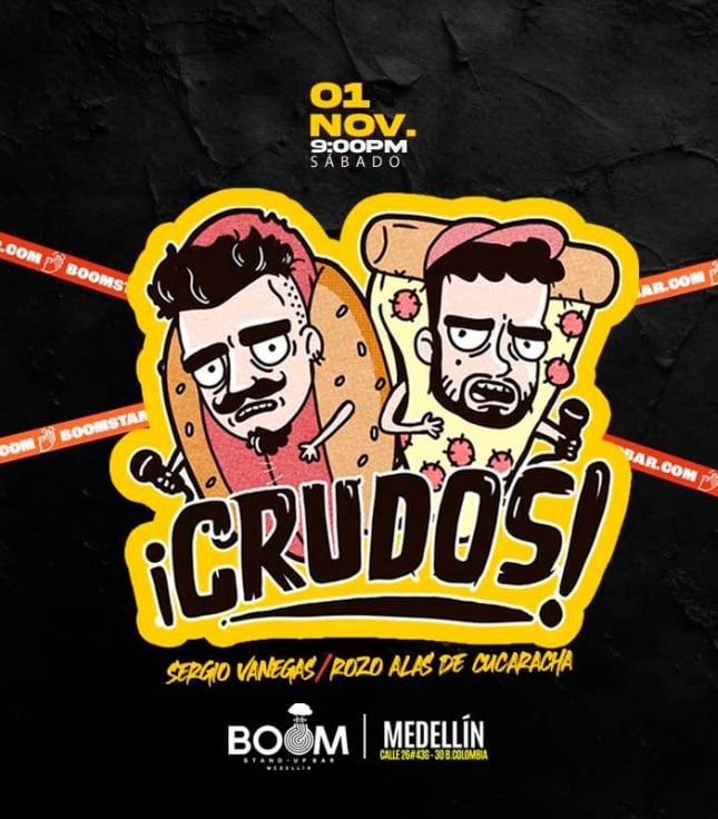 CRUDOS - SERGIO VANEGA Y ROZO ALAS DE CUCARACHA BOOM STAND UP BAR - Cl. 26 #43g-30 BARRIO COLOMBIA Medellín 01 Nov Sáb 01 Nov