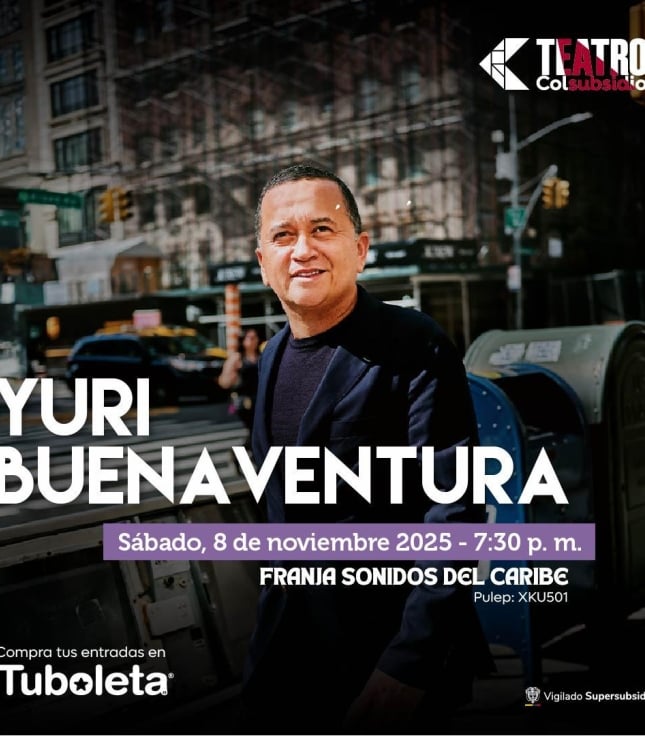 Destacados Mal Pelo, España - 'Double Infinite. The Bluebird Call' Teatro Estudio - Julio Mario Santo Domingo Bogotá Desde 07 Nov Vie 07 Nov Hasta 08 Nov Sáb 08 Nov CONCIERTO LIBERTAD: ORQUESTA COLOMBO SUIZA Auditorio Fabio Lozano Bogotá 07 Nov Vie 07 Nov La Generación del Perreo PLAZA DE TOROS DE MANIZALES Manizales 08 Nov Sáb 08 Nov CARÍN LEÓN | BOCA CHUECA TOUR 2025 Estadio El Campín Bogotá 08 Nov Sáb 08 Nov Yuri Buenaventura lanza álbum Ámame y éxitos de siempre Teatro Colsubsidio Bogotá 08 Nov Sáb 08 Nov ¡AZÚCAR! - TRIBUTO A CELIA CRUZ - 100 AÑOS DE SU NACIMIENTO Teatro Cafam Bogotá Desde 08 Nov Sáb 08 Nov Hasta 09 Nov Dom 09 Nov Nicolas y los Fumadores “Nochenegra” Teatro Santander Bucaramanga 08 Nov Sáb 08 Nov Mostrar más eventos