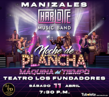 Charlotte - Noche de Plancha - Maquina del Tiempo - Manizales Teatro Fundadores Manizales 11 Abr Sáb 11 Abr Charlotte - Noche de Plancha - Maquina del Tiempo - Manizales Manizales 31 Ene Sáb