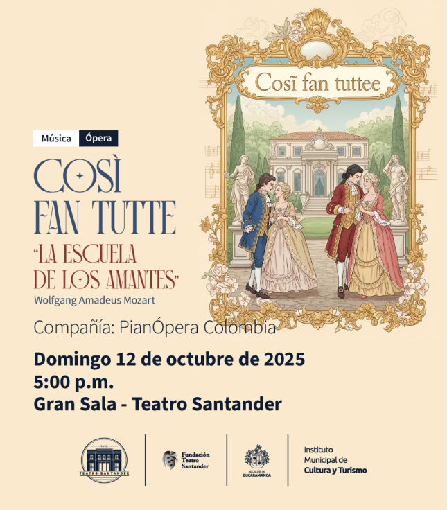 Teatro Santander Santander le canta a José Morales Teatro Santander Bucaramanga 09 Oct Jue 09 Oct MI ESPOSA JAPONESA Teatro Escuela Bucaramanga 09 Oct Jue 09 Oct COSI FAN TUTTE “LA ESCUELA DE LOS AMANTES” Teatro Santander Bucaramanga 12 Oct Dom 12 Oct FRANKENSTEIN Teatro Santander Bucaramanga 18 Oct Sáb 18 Oct Primer Cero Teatro Escuela Bucaramanga 18 Oct Sáb 18 Oct Rabito y el hada de cristal Teatro Santander Bucaramanga 19 Oct Dom 19 Oct CARMEN DE BIZET: 150 AÑOS DE PASIÓN Y MÚSICA INMORTAL Teatro Santander Bucaramanga 23 Oct Jue 23 Oct Mostrar más eventos Ubicación Cl. 33 # 18 - 60Centro, BucaramangaTeatro Santander Más Información El Teatro Santander es el principal centro de promoción, formación y presentación de espectáculos, actos artísticos, dramáticos y musicales del oriente colombiano. Galería