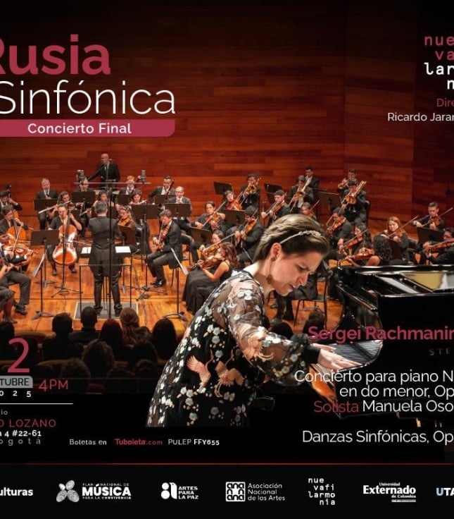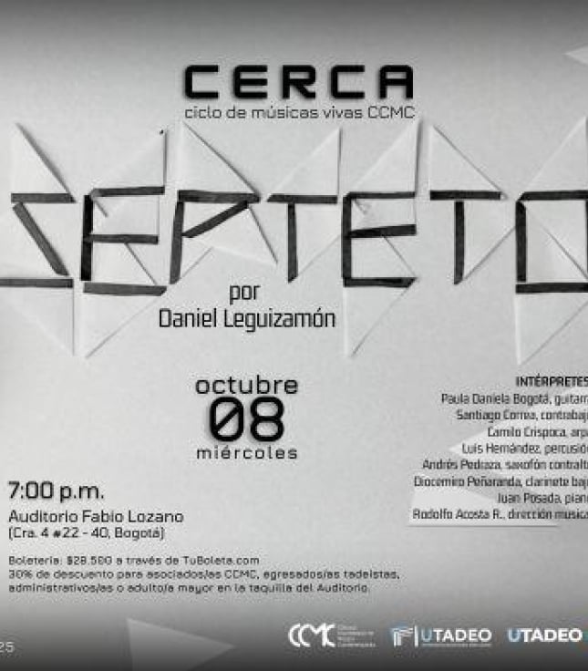 SEPTETO, POR DANIEL LEGUIZAMÓN Auditorio Fabio Lozano Bogotá 08 Oct Mié 08 Oct :Show inmersivo: Chicas Pop Planetario de Bogotá Bogotá Desde 08 Oct Mié 08 Oct Hasta 31 Oct Vie 31 Oct Santander le canta a José Morales Teatro Santander Bucaramanga 09 Oct Jue 09 Oct Show inmersivo TREN AL SUR Planetario de Bogotá Bogotá Desde 09 Oct Jue 09 Oct Hasta 31 Oct Vie 31 Oct Tomorrow Comes The Harvest Jeff Mills Planetario de Bogotá Bogotá Desde 11 Oct Sáb 11 Oct Hasta 12 Oct Dom 12 Oct ANIME Teatro Jorge Eliécer Gaitán Bogotá 11 Oct Sáb 11 Oct CONCIERTO PARA PIANO NO.2 OP.18 EN DO MENOR Auditorio Fabio Lozano Bogotá 12 Oct Dom 12 Oct Marco Tamayo (Cub, Aut) - Raúl Fernando Madrid (Col) Teatro Colsubsidio Bogotá 15 Oct Mié 15 Oct Mostrar más eventos
