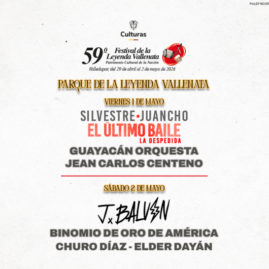 59 FESTIVAL DE LA LEYENDA VALLENATA 2026 Parque de la Leyenda Vallenata Valledupar Desde 01 Mayo Vie 01 Mayo Hasta 02 Mayo Sáb 02 Mayo