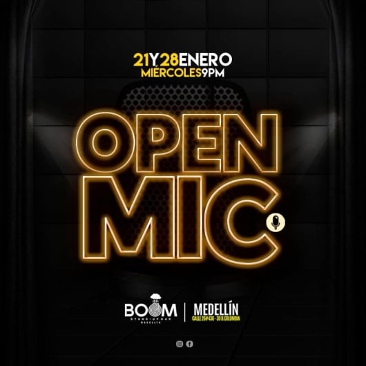 OPEN MIC (ENERO) BOOM STAND UP BAR - Cl. 26 #43g-30 BARRIO COLOMBIA Medellín Desde 21 Ene Mié 21 Ene Hasta 28 Ene Mié 28 Ene